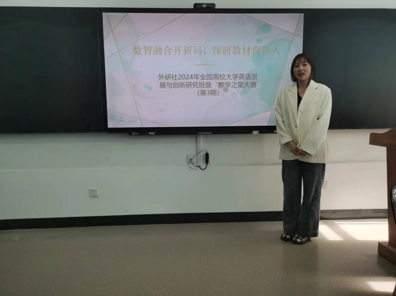 会议伊始,谷文月老师分享了她在“全国高校大学英语教学发展与创新研修班”中的学习心得。她强调了教师应如何走近学生,注重与学生的深层互动,平衡教学内容,以及如何利用数智技术个性化培养学生的自主学习能力。