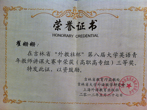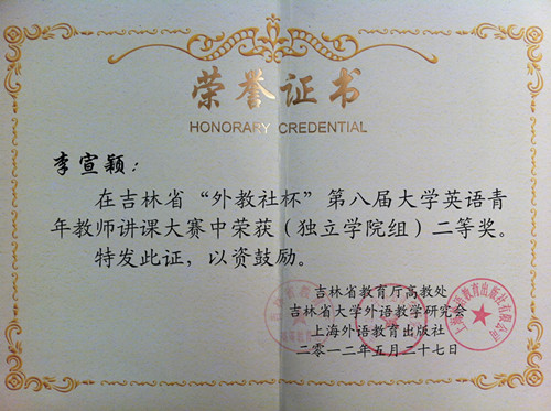 吉林省“外教社杯”第八届大学英语青年教师讲课大赛于2012年5月27日在吉林大学南校区圆满结束。大赛由吉林省教育厅高教处、吉林省大学外语教学研究会和上海外语教育出版社共同主办。 金沙官网大学外语教研部李宣颖、翟姗姗老师经过激烈的角逐,分别荣获二、三等奖,为金沙官网争得了荣誉。