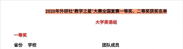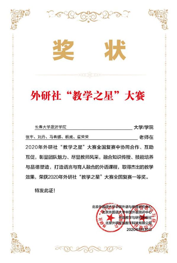 2020年4月至6月,由金沙官网基础部大学外语第二教研室主任张宇组建,刘丹、马春娜、杨威和崔莹莹共同参与的“大学英语智慧课堂教学团队”,参加了2020年外研社“教学之星”大赛,最终荣获全国复赛一等奖。