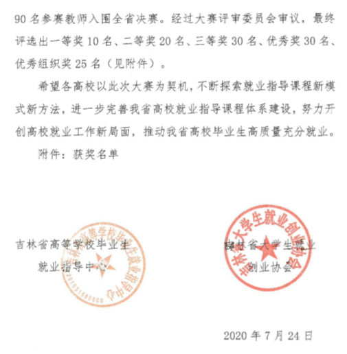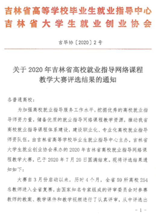 为加强高校就业指导服务工作水平,挖掘优秀的高校就业指导师资力量,储备优质的就业指导网络课程教学资源,推进我省高校就业指导课程体系建设,建设职业化、专业化就业指导师资队伍,由吉林省高等学校毕业生就业指导中心主办,吉林省大学生就业创业协会承办的2020年吉林省高校就业指导网络课程教学大赛于2020年7月20日圆满落幕。金沙官网就业指导教研室主任张丹鹤入围决赛,并荣获大赛二等奖。