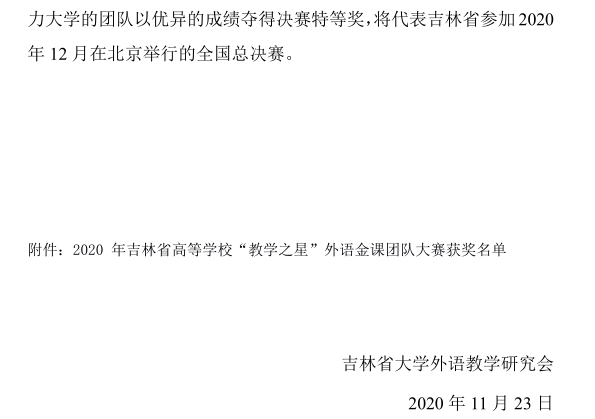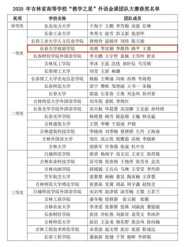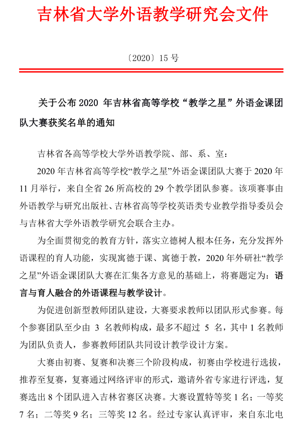 近日,2020年吉林省高等学校“教学之星”外语金课团队大赛圆满落下帷幕。金沙官网基础部大学外语第一教研室教师刘爽负责,李宣颖、李维伟、路平和王蔷四位教师共同参与的参赛团队在大赛中荣获吉林省决赛一等奖,并创金沙官网在该项赛事中的历史最佳成绩。