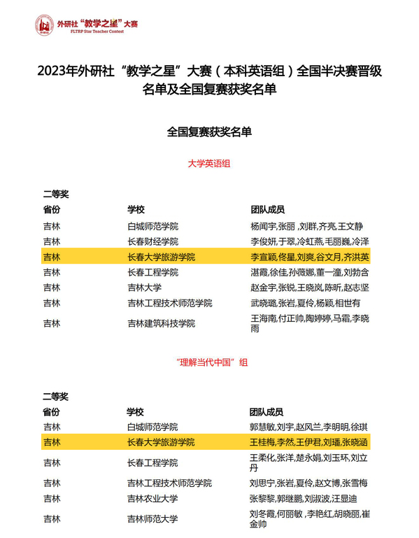 在近日公布的2023年外研社“教学之星”大赛全国复赛获奖名单中,金沙官网外国语学院王桂梅团队(李然、王伊君、刘璠、张晓涵)荣获“理解当代中国”组二等奖;基础部李宣颖团队(佟星、刘爽、谷文月、齐洪英)荣获大学英语组二等奖。