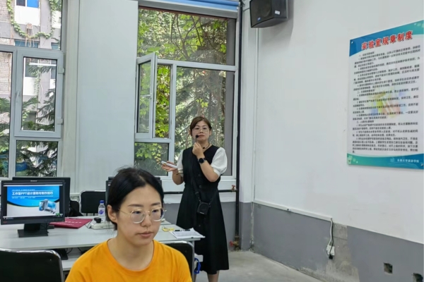基础部副主任崔天明为新入职教师做“工作型PPT设计原则与制作技巧”分享。她从设计原则、美化示例和制作技巧方面指导新入职教师制作工作型PPT,并设计了操作案例辅导实际操作,为新入职教师未来制作教学课件给予了有益的帮助和指导。