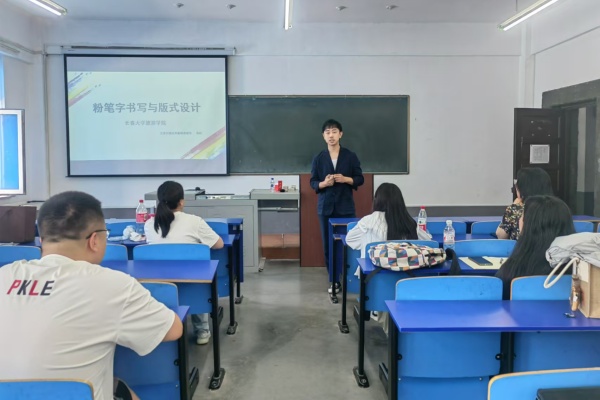 艺术学院教师郭松做“粉笔字书写与板书设计”培训。他从粉笔字的握笔方法及书写姿态、书体的选择、板书书写的版式设计向青年教师介绍如何做好板书书写和设计。