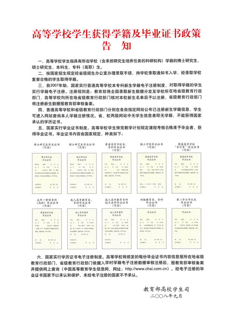 高等学校学生获得学籍及毕业证书政策告知