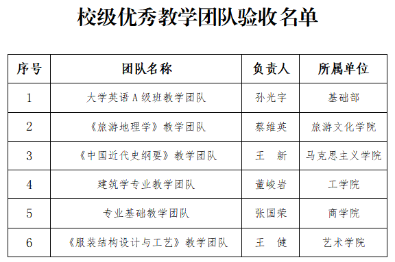 自2015年起,学校共建设“校级优秀教学团队”31个,覆盖所有教学单位,各教学团队充分发挥示范引领作用,不断深化教育教学改革,打造高水平教师队伍,有效助力了学校教育教学工作的高质量发展。