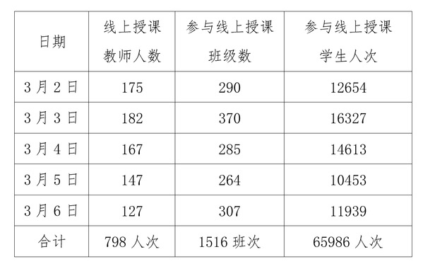 为贯彻落实教育部和省教育厅关于新型冠状病毒肺炎疫情防控工作部署的相关要求,根据《6165cc金沙总站检测中心关于2020年春季学期延期开学的教学工作方案》精神,遵循“教师不停教、学生不停学”“教学工作要求不放松,教学质量标准不降低”的基本思路,学校于3月2日正式开启了新学期网络教学新模式。一周来,校院两级齐抓共管,及时总结,加强教学过程管理,保证教学质量;全体教师依托各类网络教学平台,开展了内容丰富、形式多样的网络教学活动。现将第一周网络教学情况简报如下: