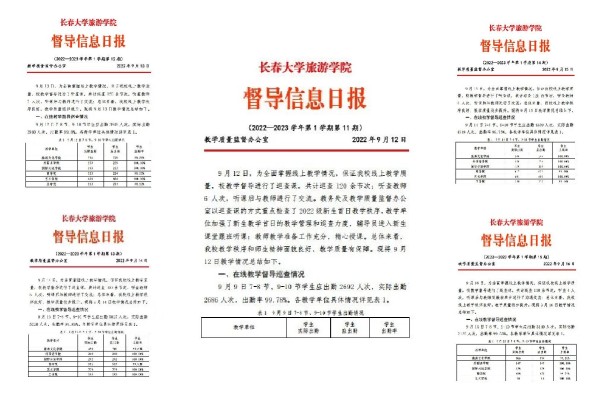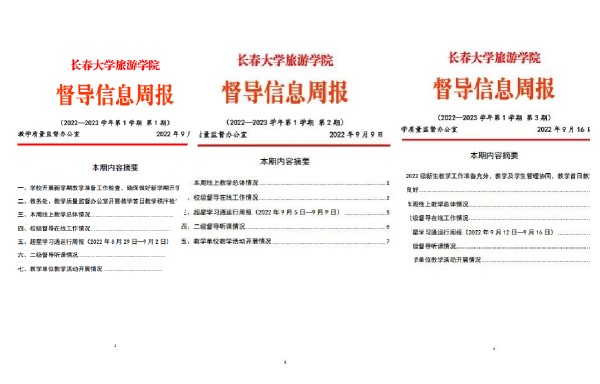 二是及时反馈,通过督导日报、周报汇总教学数据及教学状态,促进教学质量提升。校级教学督导加大每日听巡课力度和频次,听巡查课后及时与听课对象及教学单位交流、反馈教学中存在的问题。截止教学第三周,共巡查1600余节次,听查教师80人次。校级督导依据每天听巡课情况、日常教学监控数据、教学单位教学质量监控及教学活动情况,及时、准确、客观总结当天教学情况,针对出现问题提出改进建议,形成并发布当天督导信息日报;周末总结当周线上教学情况形成并发布督导信息周报。截至教学第三周,共计发布15期日报、3期周报。通过常规督导反馈及发布两报有针对性地提出的教学改进意见和建议,供教师和教学单位借鉴并及时整改,促进了教师教学水平提高。