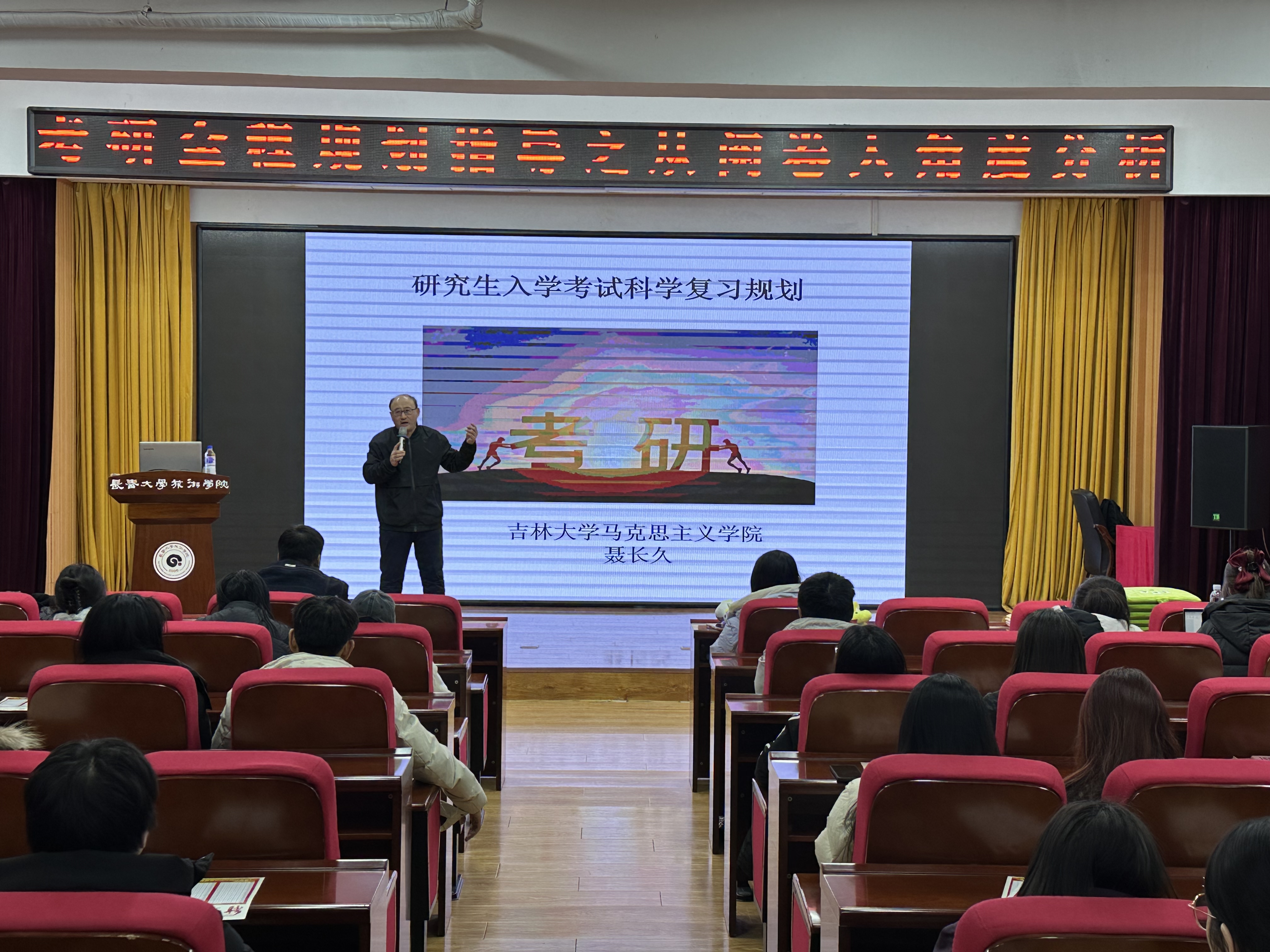 此次讲座邀请到了吉林大学马克思主义学院的聂长久教授来为学生进行授课,聂教授以幽默风趣的语言和生动的案例为学生们详细阐述了考研的重要性和必要性,考研形势及学习时间规划。还通过分享了自己多年的教学经验和成功案例,为学生们提供了实用的考前复习、如何记忆重要知识点等备考技巧和方法。
