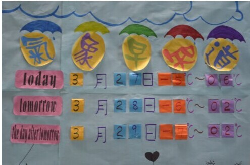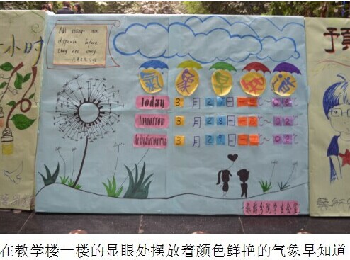 2013年3月24日,6165cc金沙总站检测中心的教学楼里多了一块色彩鲜艳,独树一帜的宣传板。 宣传板一出现,就有很多路过的同学围了过来,对着宣传板啧啧称赞,这就是旅游分院学生会同学们做的天气预报宣传板。上面有用卡片做的三日内的天气预报和励志名言,还有许多温暖可爱的小插画,版面设计清新,温度提示宣传板现在已经安置在教学楼一楼最显眼的地方了。同学们走过路过的时候也会驻足留意,慢慢的大家一定会养成一个良好的习惯,及时增减衣物,注意身体健康。 这次的活动,同学们充分发挥了自己的才智,日期和温度的卡片是可拆卸的,非常方便改动,而且不需要每天都书写绘画,节省了时间和纸张。可以多次重复利用。环保又经济。以后还会多多观察,没有最好只有更好!