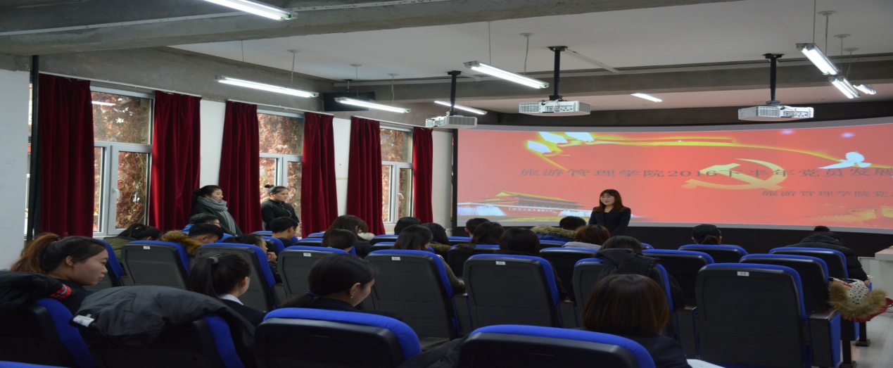 旅游管理学院2016年下半年发展大会顺利召开6月11日下午,旅游管理学院党总支在模拟实训室召开预备党员发展大会,为党总支注入新鲜血液。会议主要讨论了杜美玲等9名同志的发展问题。党总支书记高阳、旅游管理学院党总支全体党员以及重点积极分子参加了本次大会,会议由旅游管理学院党总支组织委员戴军威主持。 大会按照党员发展议程顺利进行,到会的正式党员举手表决,一致通过杜美玲等9名同志成为中共预备党员,在学生第一支部书记凤龙老师的带领下,在庄严的党旗下宣誓。 会议最后,高阳书记做总结发言。他对此次新加入的预备党员表示祝贺,并对他们提出三点要求与期望,希望他们能进一步提高政治素质、工作能力、品德修养;同时勉励在座的所有同志:也许不一定所有事都做得那麽优秀,但只要努力了,朝着这个方向走,也许不经意间就成熟了,成长了,就是属于自己的胜利。