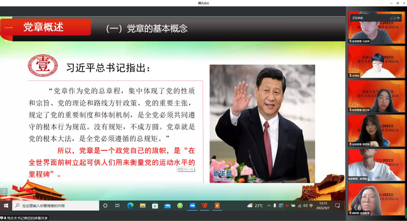 姜欣从党员、党的组织制度、党的中央组织、党的地方组织等方面向新生介绍党章内容并进行详细的分析。他强调《中国共产党章程》经历了一个不断完善的过程,体现了我们党坚持实事求是、与时俱进的原则;总纲部分系统总结了我们党在各个时期的路线、方针、政策,我们当前的学习任务意义重大,要学深学透、理解和认同党章,严格按照党章的规定办事,是大家在思想上和行动上向党组织靠拢,保持先进性的前提条件和根本保证。