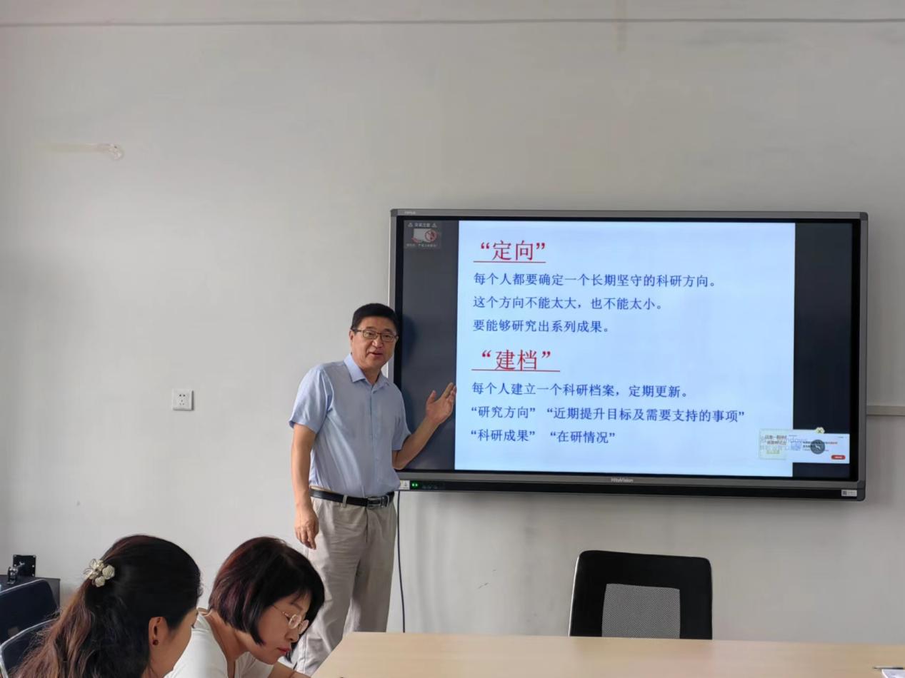 会上,关众副院长作为学院科研工作的主管领导,深刻剖析了科研工作的核心要义,他强调:科研工作一要“定向”,包括办公室人员和学工人员在内的每位老师都必须确定一个长期坚守的科研方向,围绕这一方向开展长期深入的研究,力求产出系列性、高质量的研究成果;二要“建档”,即每位老师建立科研档案,定期更新“研究方向”“近期提升目标及需要支持的事项”“科研成果”“在研情况”,实时反映科研状况;三要“阶梯推进”,所有老师要在现有基础上,阅读自己研究方向的文献,阶梯性提升科研水平,进军更高层次的科研成果。
