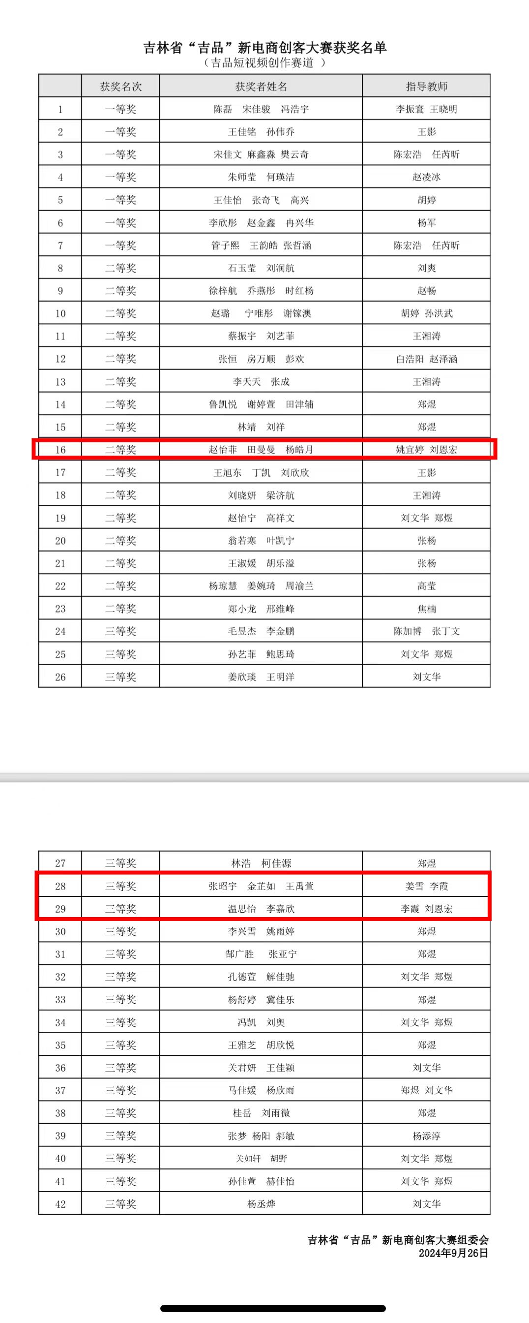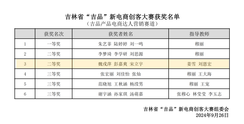 比赛设有吉品短视频创作、产品创新设计和电商达人营销三个赛道,以农博园为环境背景,为长白山特产—人参进行电商营销创作。在为期三天的比赛中,各小组经历了从选题、策划到作品制作的艰苦过程,在紧张而有序的氛围中积极探索,勤奋付出,充分展现了他们的创新能力与团队协作能力。我学院魏戌萍、彭嘉爽、宋立宇团队在电商达人营销赛道中斩获二等奖,赵怡菲、田曼曼、杨皓月团队在短视频创作赛道获得二等奖,张昭宇、金芷如、王禹萱团队和温思怡、李嘉欣团队获得三等奖。