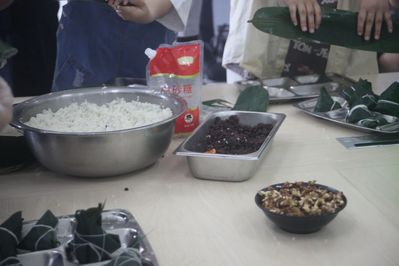 活动现场,大家都满怀期待参与此次包粽子活动。学院提前准备好糯米、咸鸭蛋、蜜枣、核桃、红豆、粽叶以及包粽子所需的盆、线、刀等用品用具并整齐地摆放在活动现场的桌上。学院团委书记兼学生工作办公室主任张锦华、团委学生副书记田茂欣和学生们围坐在一起,共同参与包粽子的过程。田茂欣首先向学生介绍了端午节的由来和传统习俗,让大家对这个节日有了更深入地了解。随后,开始示范包粽子的方法,学生们认真地观察着,模仿着她的动作。