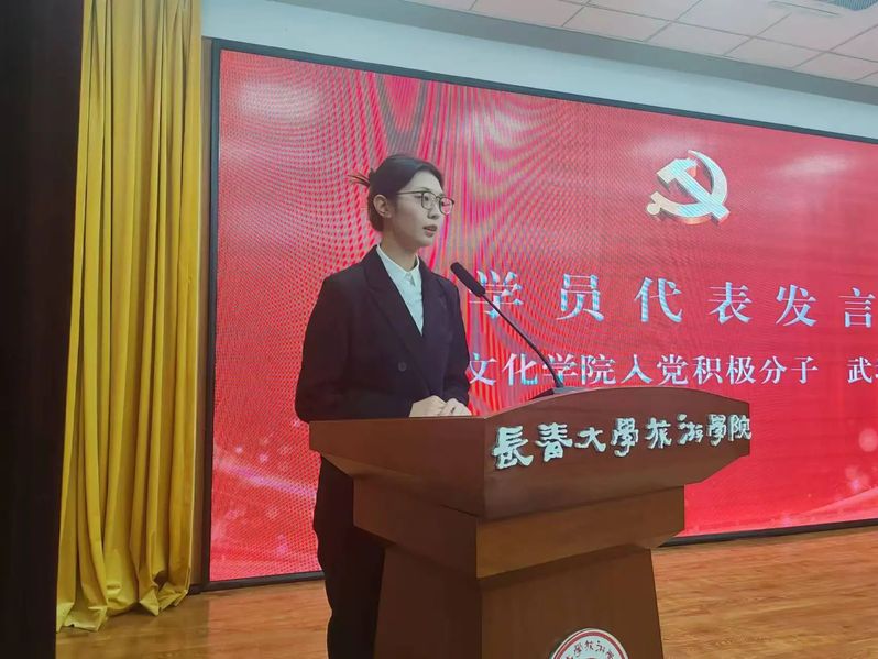 旅游文化学院武境湫同学作为学员代表发言。她表示入党积极分子要以饱满的热情投身到党的各项事业中去,做有为青年,争做符合党和人民期望的社会主义建设者和接班人。