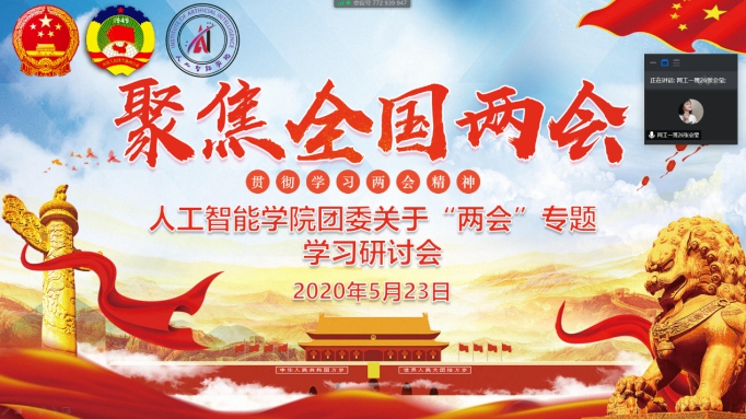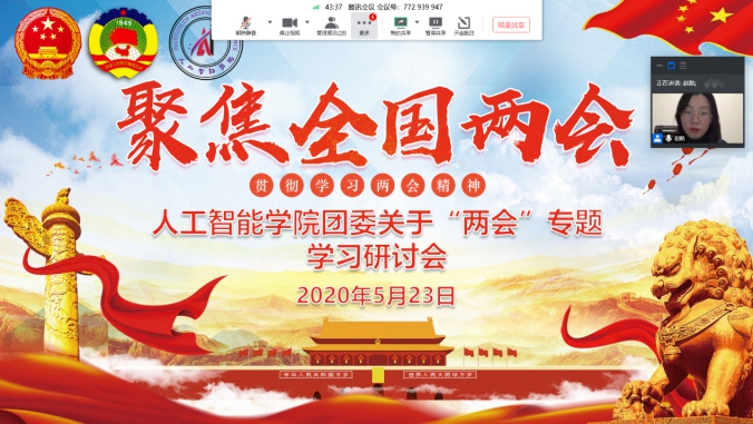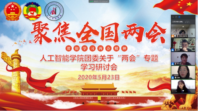 为了深入学习贯彻“两会”精神,2020年5月23日,6165cc金沙总站检测中心人工智能学院团委通过云端在线的方式组织召开2020年全国“两会”精神学习研讨大会。人工智能学院党总支副书记王磊,分团委书记兼学生工作办公室主任赵航,以及学团组织全体学生干部和部分学生代表参加了此次会议,会议由人工智能学院分团委书记赵航主持。
