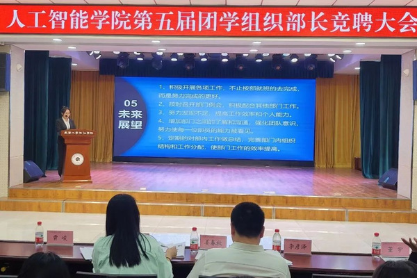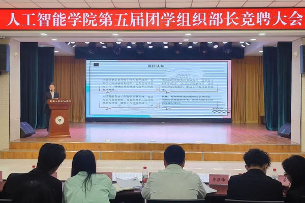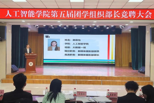 为进一步完善学院团学组织建设,增强学生组织的凝聚力和向心力,推动团学组织各项工作顺利开展,9月2日晚,人工智能学院团委在大学生活动中心召开第五届团学组织部长换届大会,69名学生参加本次竞聘,人工智能学院党总支书记孙丽影、团委书记姜春秋出席本次大会。