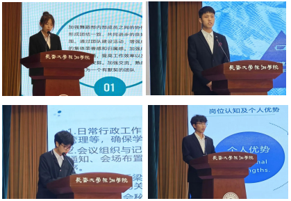 在竞聘过程中,各位学生按照抽签顺序依次进行竞聘演讲,他们围绕工作经历、竞争优势及未来展望等多个方面展开。他们用热情与执着充分展现了对学生组织的热爱和留恋,他们在言语中流露出部门间合作交流的重要性,主张培养部员个性化发展,根据部员擅长的工作和领域合理分配任务,增强积极性和主动性,充分发挥部员能动性,并汲取部员的创新性意见,满足学生发展需求。