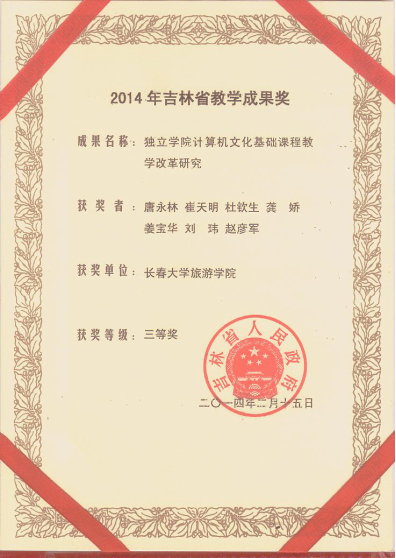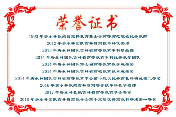 2022年获吉林省教学成果三等奖,吉林省高等教育学会第13次优秀高教科研成果二等奖,吉林省高校教育技术成果三等奖,吉林省第九届教育科学优秀成果三等奖,吉林省高等教育学会第14次优秀高教科研成果三等奖,吉林省高教学会第15届优秀高教科研成果一等奖。