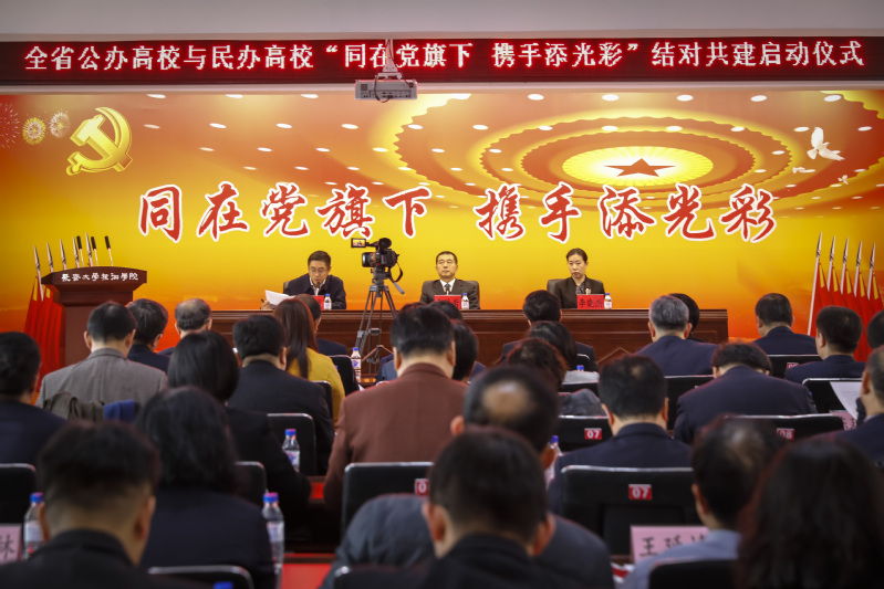 金沙官网副董事长郑晓明代表结对共建民办高校致辞,她表示,此次全省公办高校与民办高校“同在党旗下,携手添光彩”结对共建活动启动仪式在金沙官网举办深感荣幸。她代表全校师生对前来参加结对共建启动仪式的各位领导表示热烈欢迎,对选派到民办高校的各位党委书记、督导专员表示衷心的祝贺,并向长期以来关心、支持、帮助金沙官网建设与发展的省委组织部、省高校工委、教育厅领导及兄弟院校的领导们表示诚挚谢意。她简要介绍了金沙官网的基本情况,以及学校依托党建和思想政治工作深入推进学校各项事业发展取得的成绩。她最后表示,学校董事会将一如既往地重视党建工作,在人力、物力、财力上保证党建工作有效开展,使党务工作者干事有平台、待遇有保障、发展有空间;积极探索新形势下加强民办高校党建、思想政治工作新思路,结合学校实际开展党建特色项目建设,努力提升党建工作科学化水平,开创党建工作新局面。