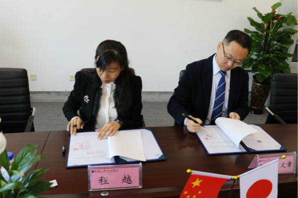 黄江教授对建立友好校的意义、国际交流合作的重要性、教学国际化等方面进行了介绍,中日双方学校代表签署了两校正式友好合作协议书。国际交流学院院长(国际交流处处长)黄江教授就设立留日学生奖学金、留日学生提供安全的勤工俭学机会、教师互派、共同开展科研合作、在两校优势专业开展联合办学及教学科研合作等方面展开了协商与交流。