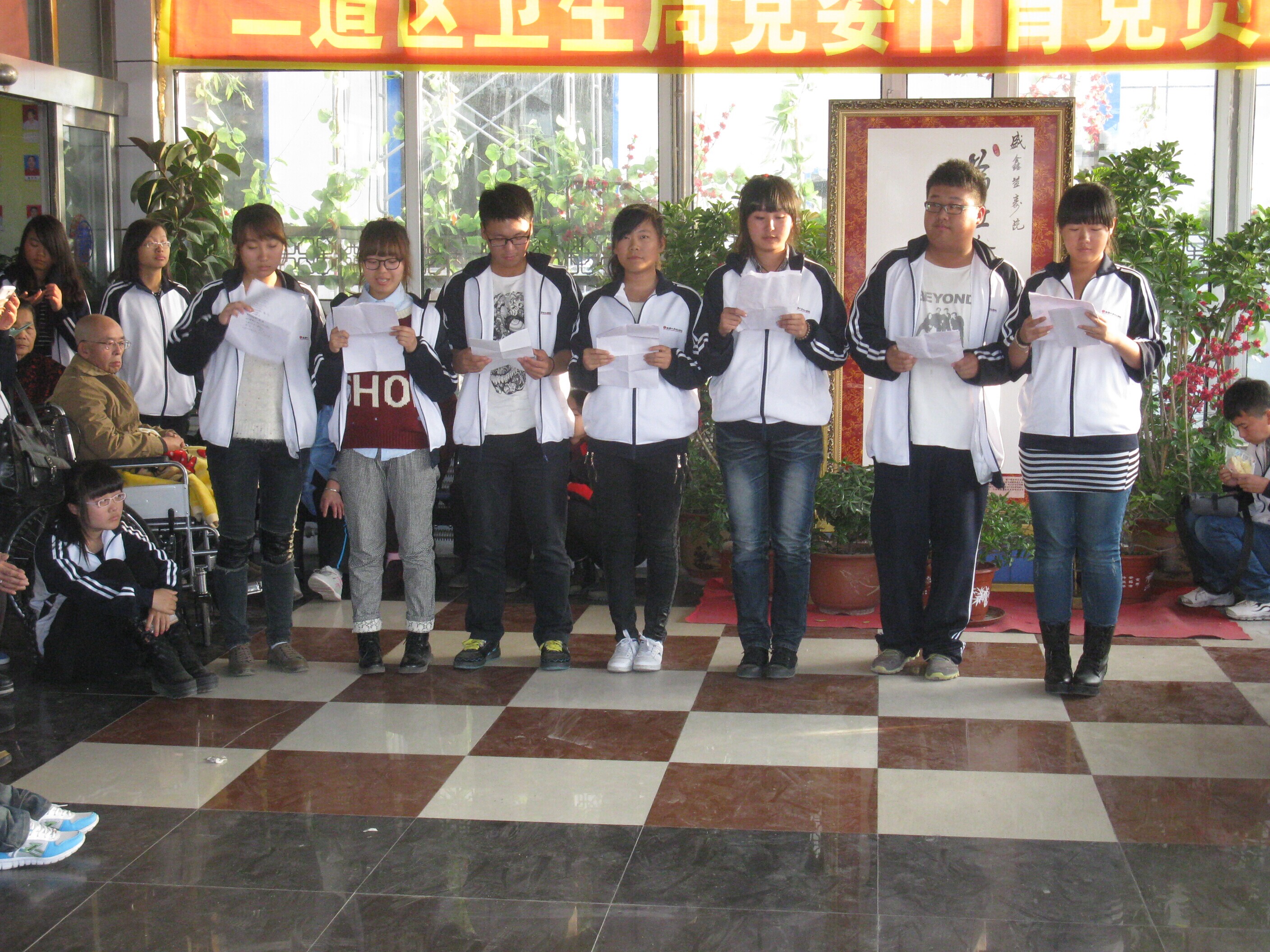 我们的到来似乎给整个敬老院都带来了欢乐!那些照顾爷爷奶奶的阿姨们也因为我们的到来感到十分高兴。我们和爷爷奶奶们聊天,他们告诉我们他们在那里生活的很好。他们可以在吃完晚饭之后叫上自己的同伴一起去散步,也可以和其他的同伴一起下下象棋,讲讲自己以前的故事。紧接着我们表演了一些精彩的节目,有相声、歌曲、诗朗诵。当看到他们每一个人的脸上都洋溢着幸福的微笑时,我们觉得这一切都是对的。他们一遍遍的告诉我们:要努力学习将来成为一名栋梁之才,为社会贡献自己的力量。