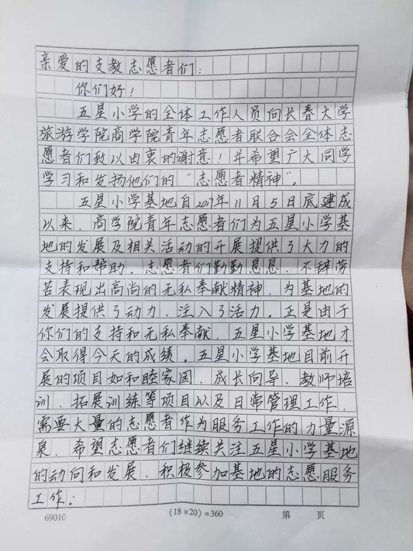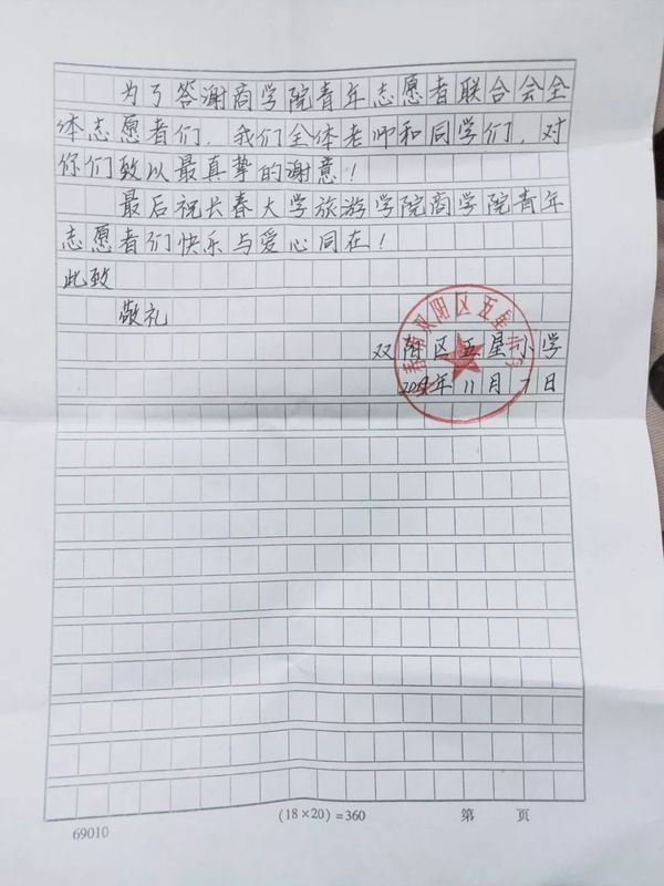 短暂的教学活动伴随着下课铃声圆满结束,通过此次活动不仅给孩子们带去了知识与欢乐,更锻炼了志愿者们的自身素质。临别时,五星小学的负责老师送给了我们一封感谢信,信中对我院志愿者团队一如既往的爱心行为表示崇高的敬意,同时这象征着我院志愿者活动从活动方式向生活方式的有效转变,更为志愿者们今后的学习和生活鼓足了干劲。