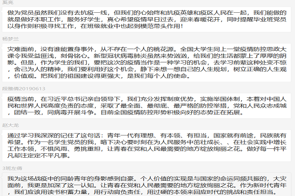奚亮同志:做为党员虽然我们没有去抗疫一线,但我们的心始终和抗疫英雄和疫区人 民在一起,我们能做的就是做好本职工作,服务好学生,真心希望疫情早日过去,迎来春暖花开,同时提醒毕业班党员以身作则积极寻找工作,在班级就业中也起到模范带头作用!
