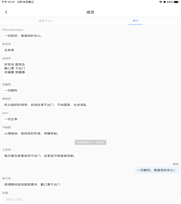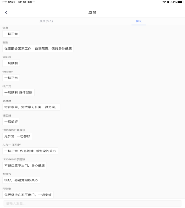 随后,全体党员相互交流,慰问疫情期间近况,像关心家人一样关心同志。全体党员表示响应国家号召,重视防疫工作,并在家保持着身心健康的状态。