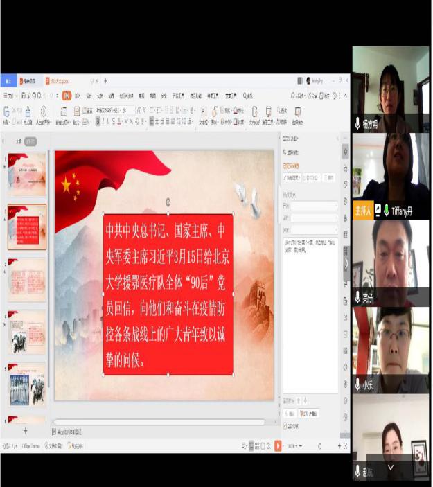3月18日商学院学生第一、第二党支部召开党员大会,全体党员以腾讯会议的形式准时参加。本次会议旨在学习“习近平回信勉励北京大学援鄂医疗队全体90后党员—让青春在党和人民需要的地方绽放绚丽花”内容以及精神。同时,全体党员关心同志,互相问候疫情期间个人近况。