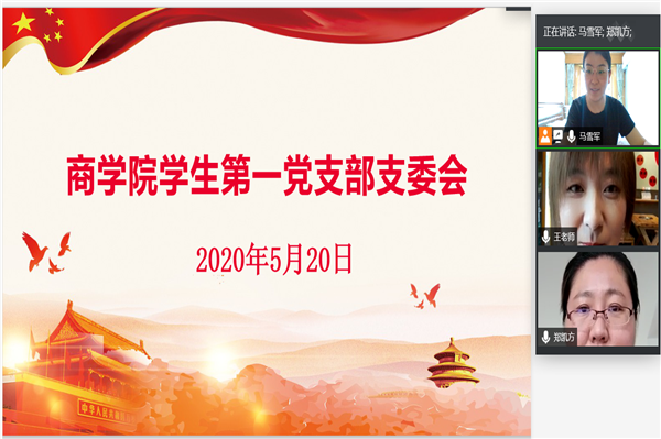 根据商学院党总支的安排部署,确保疫情防控期间党务工作常态化,2020年5月19日,商学院学生第一党支部支委成员通过腾讯会议,在线召开了支部委员会,支部书记马雪军同志主持了此次会议,经过协商探讨,对五月份党建工作进行了如下部署: