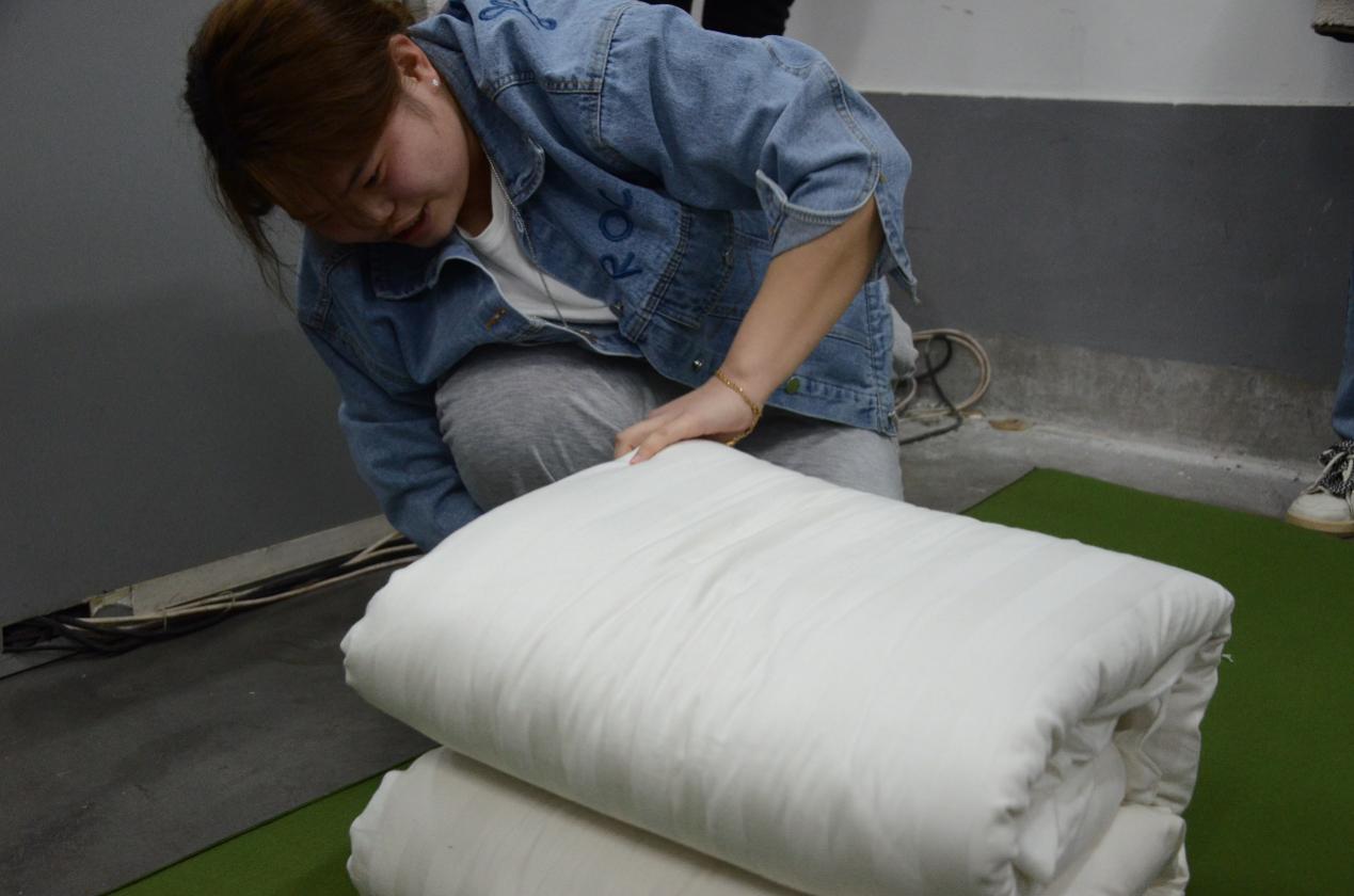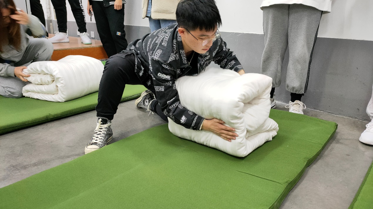 此次活动以寝室为单位,共有20余个寝室参赛,每个寝室派出一位代表,最终结果由评委打分选出。活动现场气氛活跃,教室里充斥着室友的指导声和呐喊声,参赛选手热情高涨,争分夺秒,各展风采。转眼间,一个个棱角分明、整齐方正的“豆腐块儿”便出现在同学们的眼前。经过激烈的角逐,最终10公寓117寝室拔得头筹,夺得桂冠。