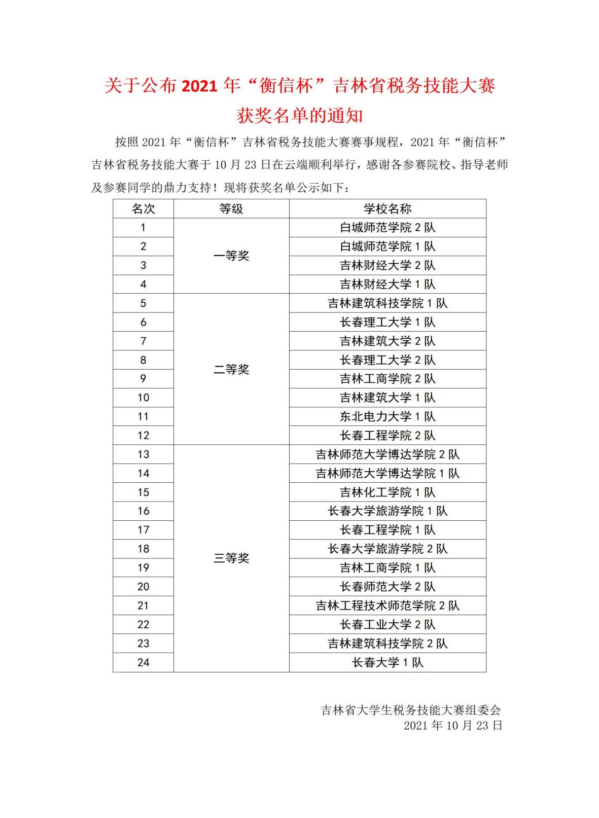 2021年10月23日,在吉林省教育厅举办的2021年“衡信杯”吉林省大学生税务技能大赛中,金沙官网商学院王玉华和王婷婷老师带领两支参赛队伍经过激烈角逐,从全省19所高校40支队伍中脱颖而出,荣获吉林省赛三等奖的优异成绩。