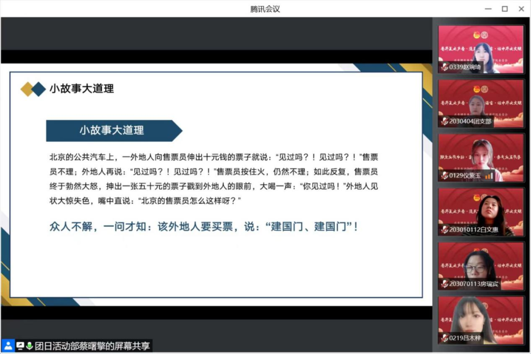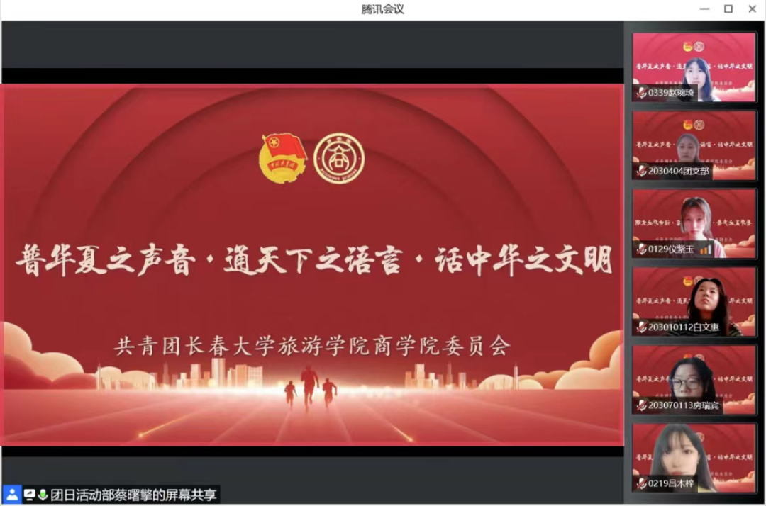 普通话是我国的通用语言,它是中华民族向世界发出的声音。在第25届推广普通话宣传周到来之际,为大力推广和规范使用国家通用语言文字,更好的继承和发扬中华民族优秀传统文化,进一步增强支部生语言文字规范意识,铸牢中华民族共同体意识。商学院学生第一党支部于9月13日在线上开展了“推广普通话”主题党日活动。