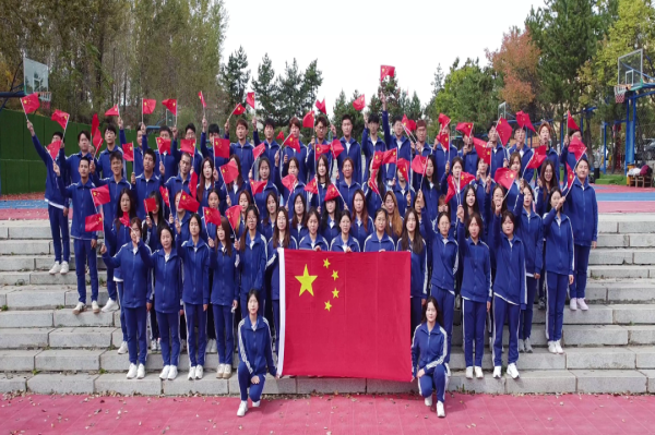 青年强则国强,青年兴则国兴。同学们身披校服,汇聚在绿茵场上,以青年身影书画五星图画,五星红旗随风飘扬,向祖国表达美好的祝愿,用热血和青春向党致敬,以昂扬精神为国庆献礼。生在红旗下,长在春风里,目光所致,皆为华夏,五星闪耀,皆为信仰。矢志不渝,吾辈青年共斩棘,长空乐潮,望以吾辈之青春,护盛世之中华,愿美丽祖国繁荣昌盛,璀璨辉煌。