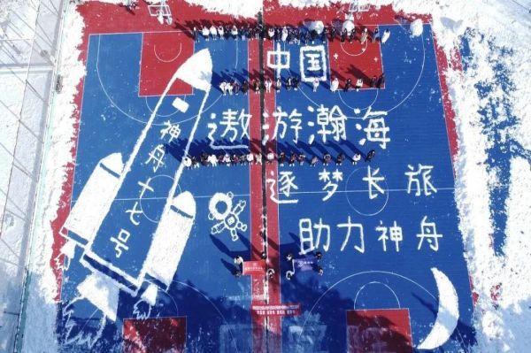 为了热烈庆祝神舟十七号圆满发射成功,11月9日三十余名长旅学子,历时7个小时,以积雪为墨,作画抒情,绘制以“遨游瀚海·逐梦长旅·助力神舟”为主题的,总面积1160平方米的雪地画。