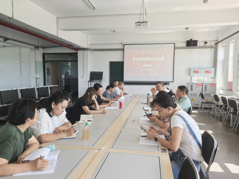 8月25日下午,商学院在606实训室开展专业集群建设交流会,本次会议由院长胡静波主持,学院领导班子、各专业学科带头人及教研室主任共同参会。