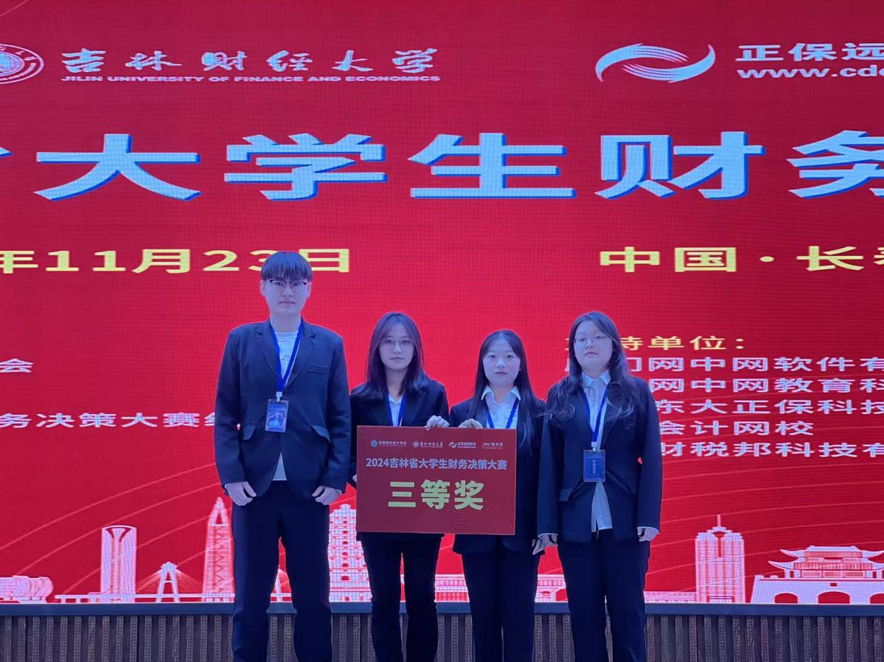 11月23日,第十二届“网中网杯”吉林省大学生财务决策大赛在吉林财经大学圆满落幕。商学院会计学教研室主任郑怡婷带领商学院2022级学生徐钰瑶、王莹莹、陈笔、宋世杰、罗溶楠及2023级学生黄宏健、龚晨、谢霏组成的两支队伍,在比赛中表现出色,荣获省级一等奖和省级三等奖。