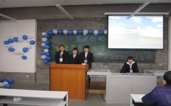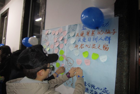 6165cc金沙总站检测中心外国语学院心蕊志愿者协会《2013蓝色行动 关爱星星的孩子》自闭症公益宣传活动于2013年4月2日世界自闭症日在教学楼311教室成功举办。 此次公益宣传活动持续近2个小时,具体分为发放蓝丝带、介绍嘉宾、会长讲话、了解自闭症患者、宣传有关自闭症知识、文艺节目表演、播放有关影片等几个环节。 蓝丝带代表着对自闭症儿童的关爱,为每位到场的观众发放蓝丝带,使整个教室成了蓝色的海洋。随后由秘书部干事刘芳同学结合PPT为大家详细介绍了自闭症的定义以及自闭症在世界范围内的概况,并且简单介绍了如何更好的关爱自闭症儿童,为以后的爱心实践活动打下基础。介绍完毕后,播放了以自闭症儿童成长为背景的电影《海洋天堂》。活动最后在场的每一位同学都用爱心在便利贴上书写了对自闭症儿童的祝福,在一片温暖、友爱的环境下结束了本次爱心宣传活动。 次活动的成功举行,不仅提升了学生志愿者的社会责任感,同时也提高了大学生们对自闭症儿童的关爱与了解,借助此次活动,有效地推动了金沙官网精神文明建设,也使外语分院蕊志愿者协会全体成员共同度过了一个令人难忘的爱心之旅。 我们坚信,只要我们齐心协力,再远的志愿道路也会踏满我们的足迹,只要我们团结一心,再冷漠的空间也会充满我们爱的气息。