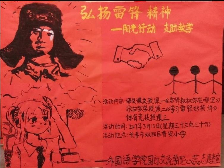 2017年3月15日,外国语学院心蕊志愿者协会举办的弘扬雷锋精神之“阳光行动,支教助学”爱心支教活动在长春市双阳区普安小学拉开序幕。参与本次支教的主要有6165cc金沙总站检测中心外国语学院心蕊志愿者协会主席陈强,秘书长董文源,及心蕊志愿者协会的一位部长、六位副部长和九名干事,志愿者们都怀着满腔热忱,积极投入到支教活动中。