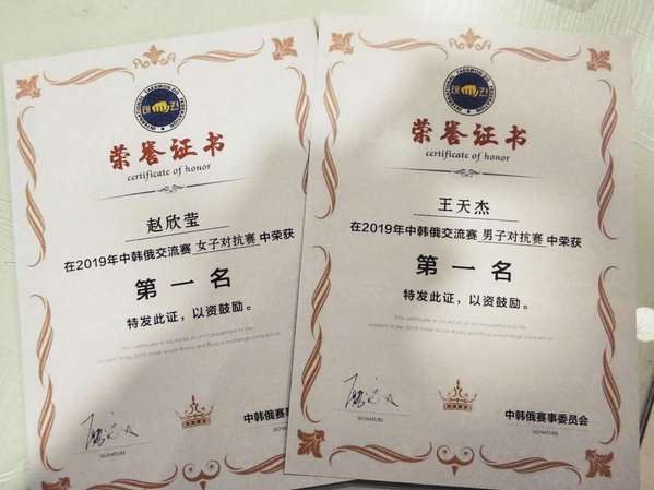 此次比赛中,金沙官网队员准备充分、发挥出色,格斗协会会长王天杰在男子对抗赛中获得冠军、副会长赵欣莹在女子对抗赛中荣获冠军、指导师范王邱石获得“跆拳道事业贡献奖”;此外,主办方还授予了金沙官网“十佳跆拳道馆”荣誉称号。