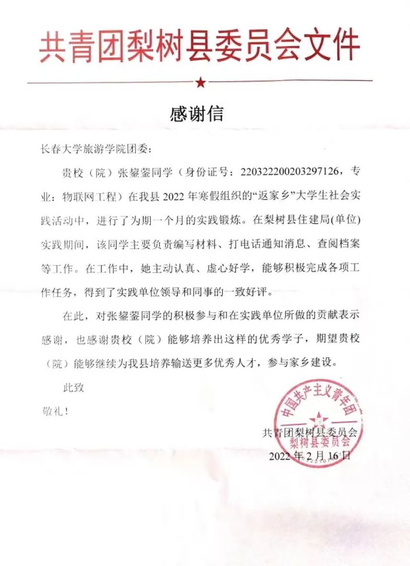 近日,金沙官网收到一封来自共青团梨树县委员会的感谢信,特别感谢金沙官网2020级物联网工程专业张鋆蓥同学。这个寒假里,张鋆蓥同学积极响应团中央、团吉林省委和校团委的号召,第一时间投入到梨树县2022年寒假大学生“返家乡”社会实践活动中,在梨树县住建局实践期间,主要负责编写材料、传递信息、查阅档案等工作。她的勤奋努力、敬业奉献精神得到了实践单位和服务群众的一致好评。