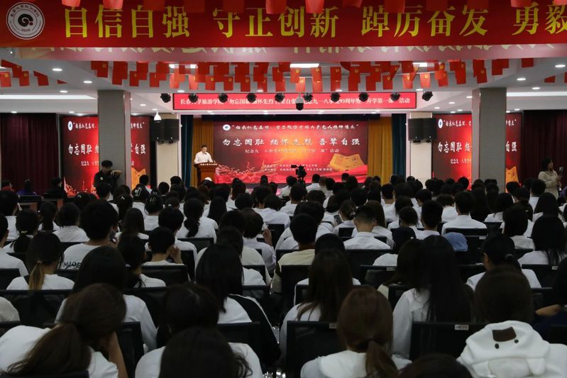 铭记历史,勿忘国耻。9月18日下午,学校党委宣传部、马克思主义学院联合党委组织部、党委学生工作部、校友办和校团委在大学生活动中心举办“勿忘国耻 缅怀先烈 吾辈自强”纪念九一八事变93周年暨“开学第一课”活动,特别邀请长春市翰林起点学校党支部书记兼校长、学校2017届毕业生于宗泽讲授“开学第一课”。活动由党委宣传部部长张帆主持。