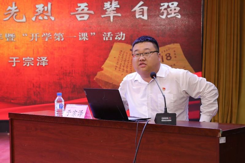 活动中,于宗泽以《勿忘国耻缅怀先烈吾辈自强》为主题为现场师生讲授“开学第一课”。他表示,九一八事变是中国抗日战争的起点,揭开了第二次世界大战东方战场的序幕。他号召同学们勿忘九一八,吾辈当自强。要以浴血奋战十四年的东北抗日联军为榜样,努力学习,树立爱国主义思想,树立正确党史观,努力学习科学文化知识,在党的非凡历程中感悟马克思主义的真理力量和实践力量。