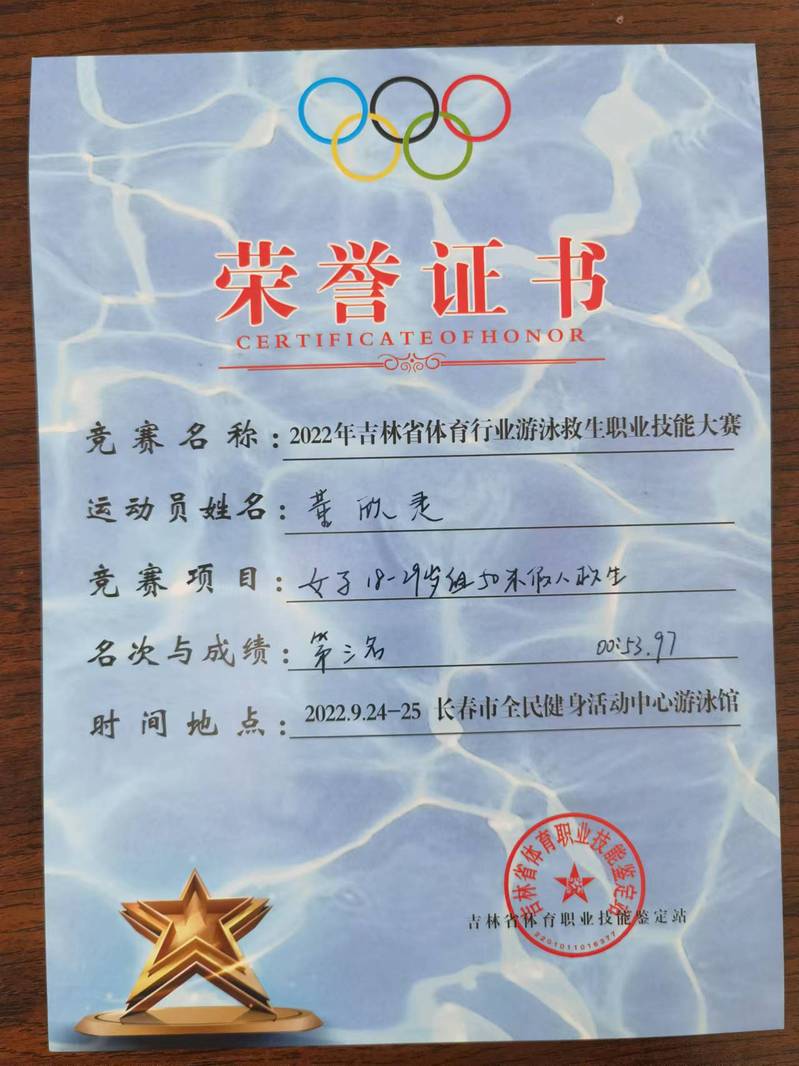 2022年9月25日,2022年吉林省体育行业游泳救生职业技能大赛圆满成功闭幕。在接到《关于举办2022年吉林省游泳救生职业技能大赛的通知》后,得到学校领导的大力支持,由于参赛运动员资格需持有游泳救生员国职证书,因此学校派出一名教师,一名学生参赛,虽然人少但是目的是为了展示学校体育精神面貌,带动全校师生热爱运动,促进全校师生健身新发展。