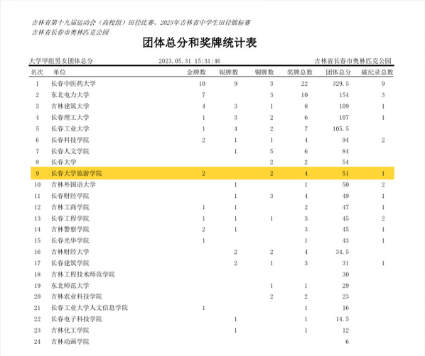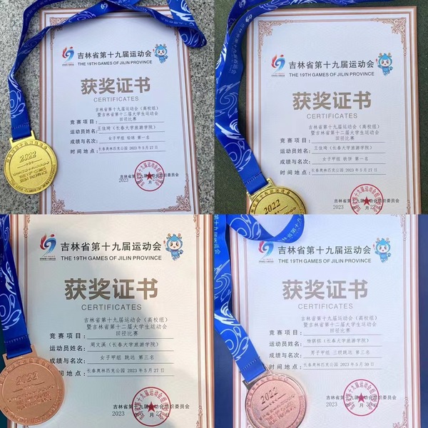 5月27日至30日,吉林省第十九届运动会(高校组)暨吉林省第十二届大学生运动会田径比赛在长春奥林匹克公园举行。学校代表队在体育教研部主任毛岩,教师李长峰和林子程的带领下,与省内54所高校、57支队伍、1049名运动员同台竞技、奋勇拼搏,在比赛中摘得2金2铜,荣获甲组团体总分第9名、男子团体总分第1名、女子团体总分第9名的优异成绩。