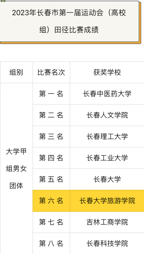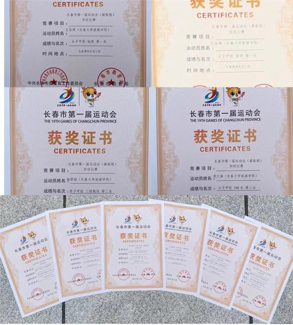 5月31日至6月1日的长春市第一届运动会(高校组)田径比赛中,学校代表队凝心聚力、奋勇争先、再创辉煌,摘得2金2银1铜,喜获团体总分第六名。王佳琦同学再次获得大学女子甲组铅球、铁饼双冠军,周文溪同学获得大学女子甲组跳远亚军和100米季军,杨骐铭同学获得男子甲组三级跳亚军。