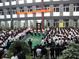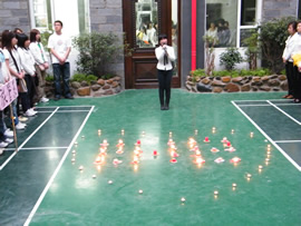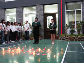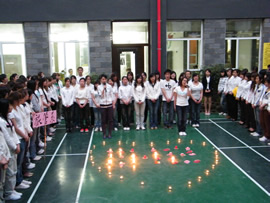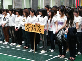 5月12日下午,我系150名学生参加学院组织的纪念5•12诗歌朗诵会,悼念大地震中死去的同胞。07级英语班学生在会上表演合唱《感恩的心》。