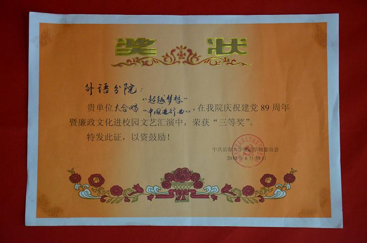 建党89周年暨廉政文化进校园文艺汇演“三等奖”-2010年